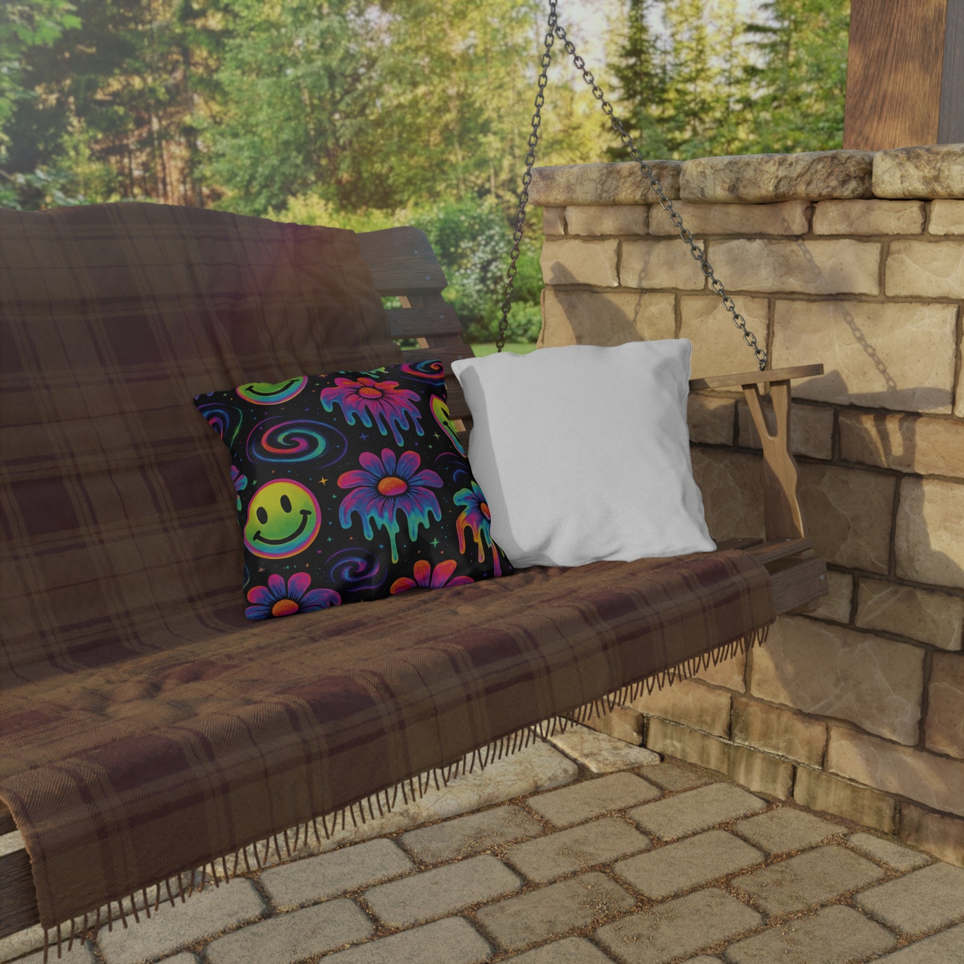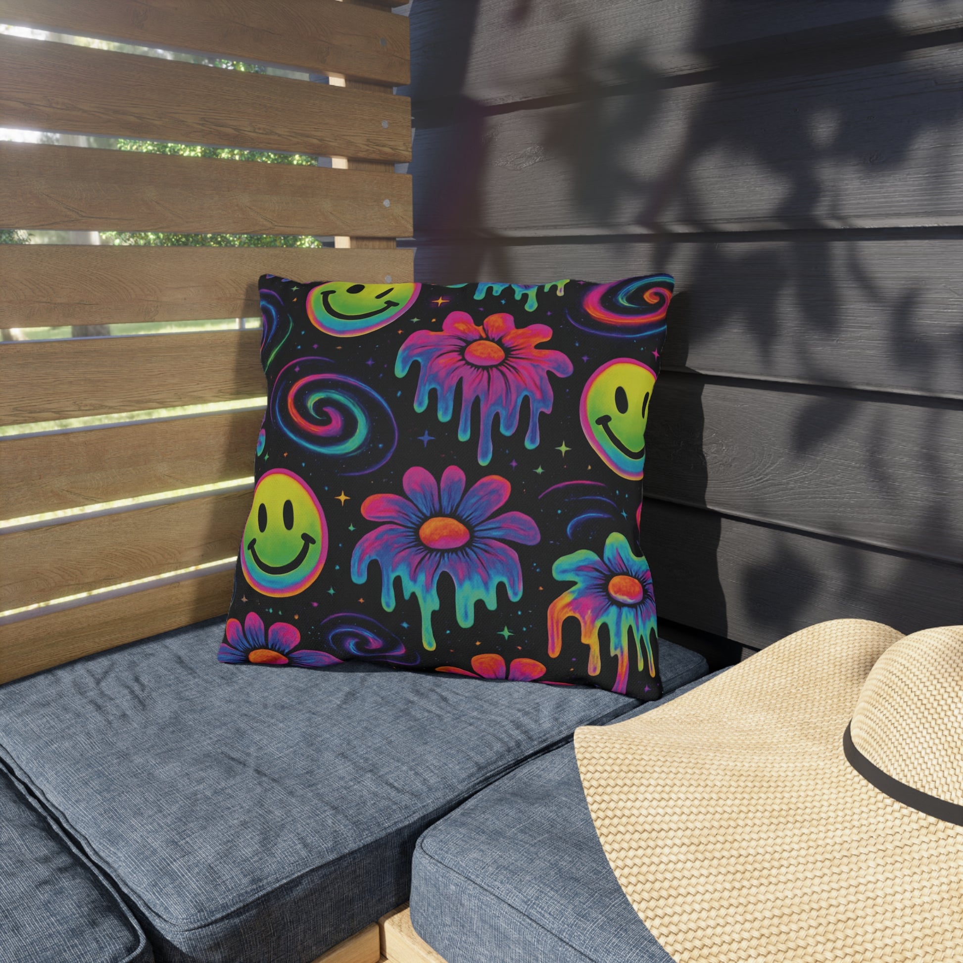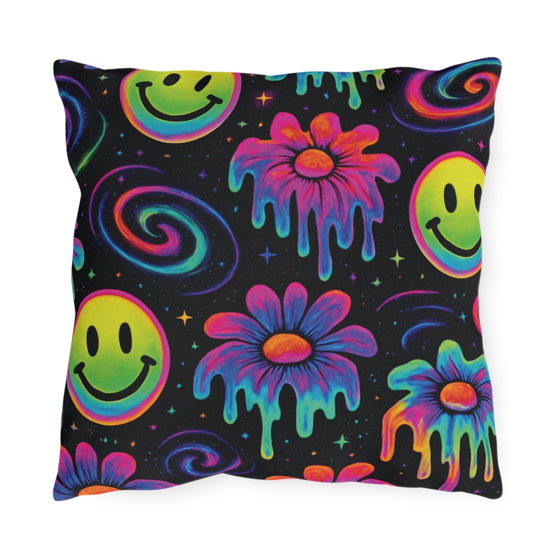 Bright and vibrant outdoor pillows featuring smiley faces and flowers. Perfect for adding a touch of fun and color to your outdoor space. Ideal for those who enjoy spending time in their backyard, garden, patio, or balcony. Great for summer parties, picnics, and outdoor gatherings.