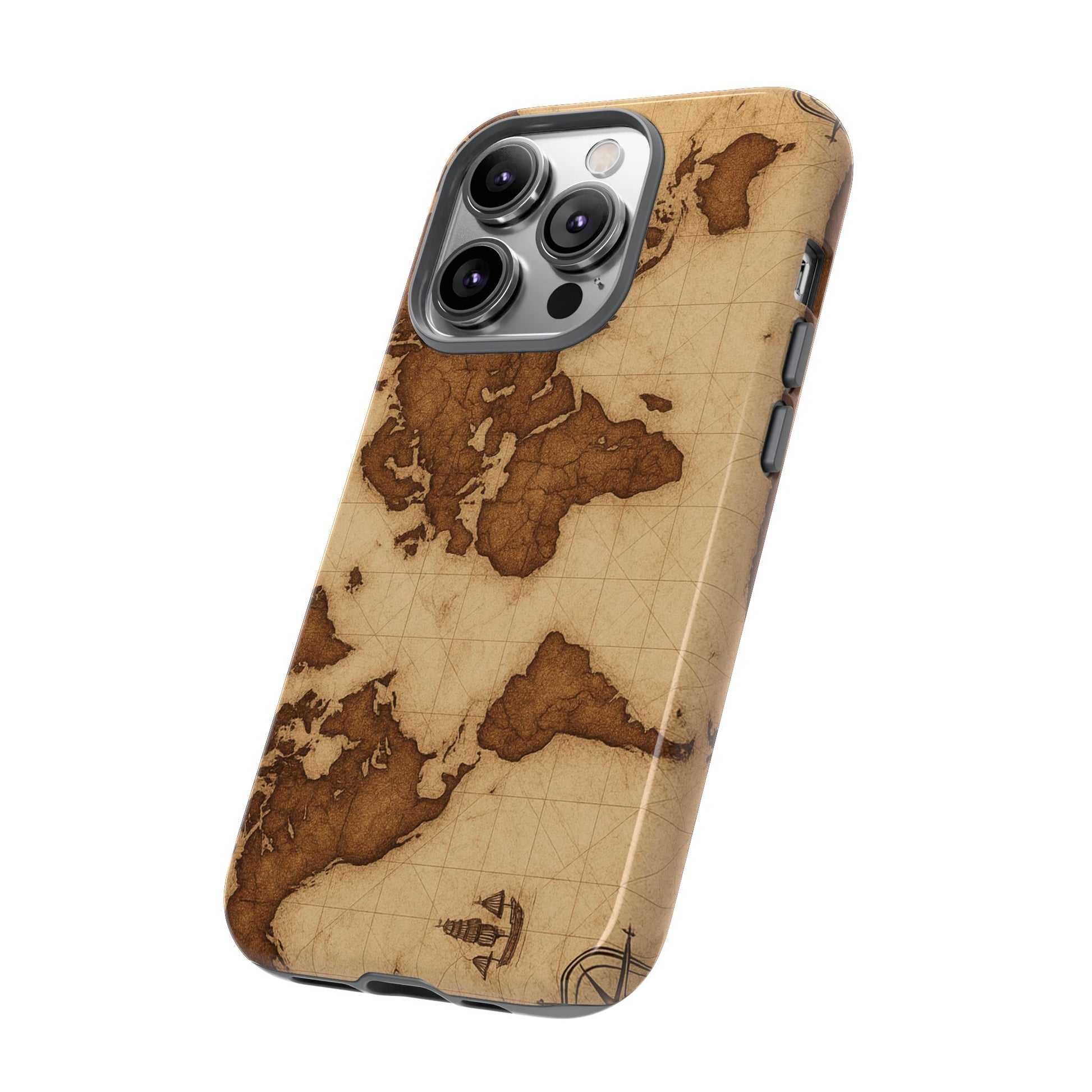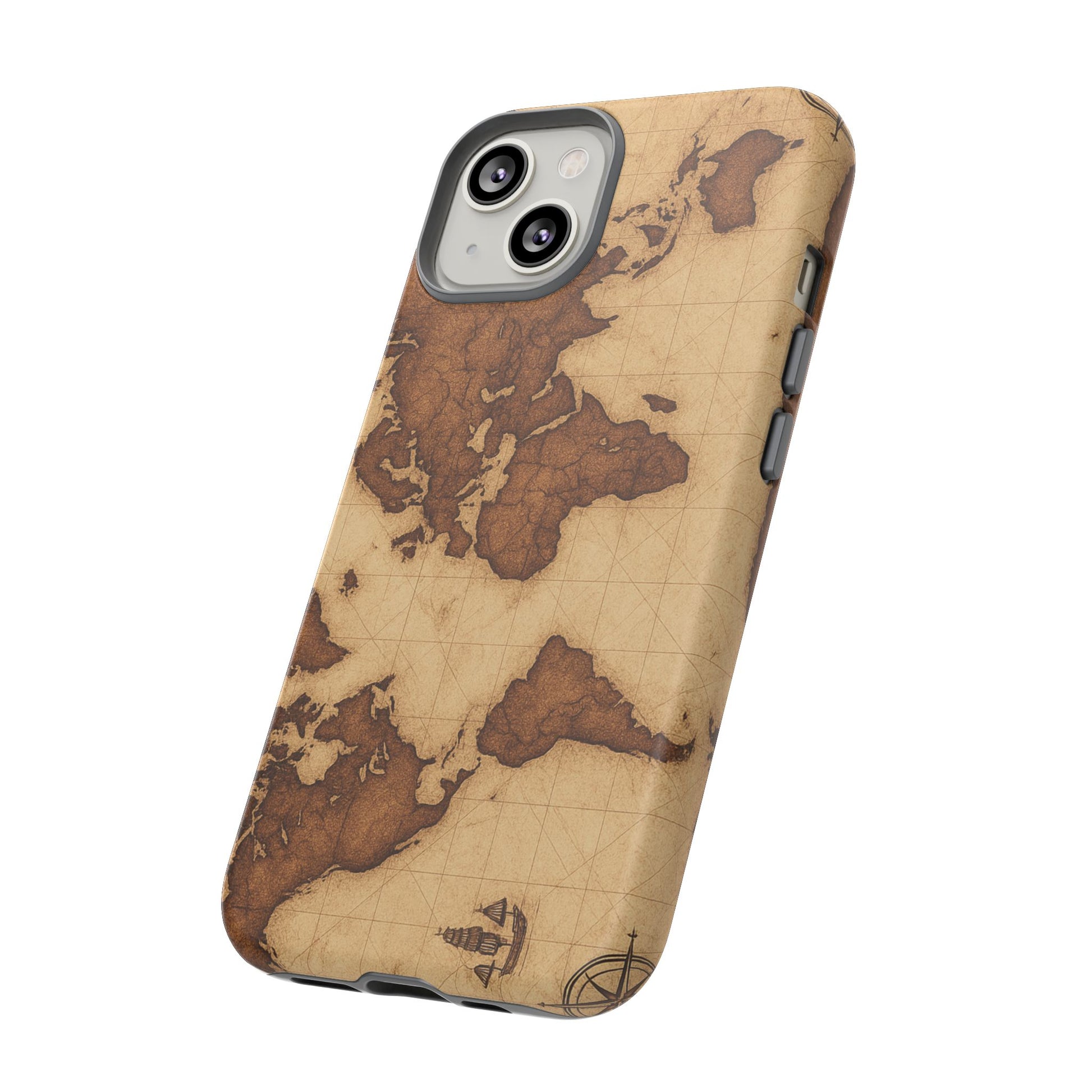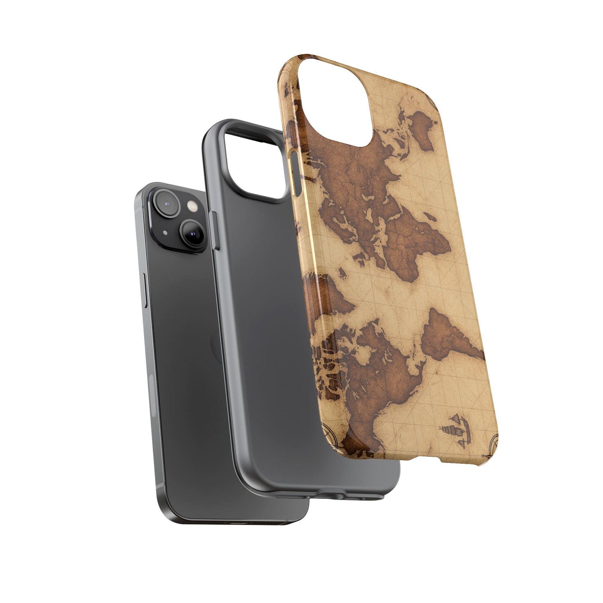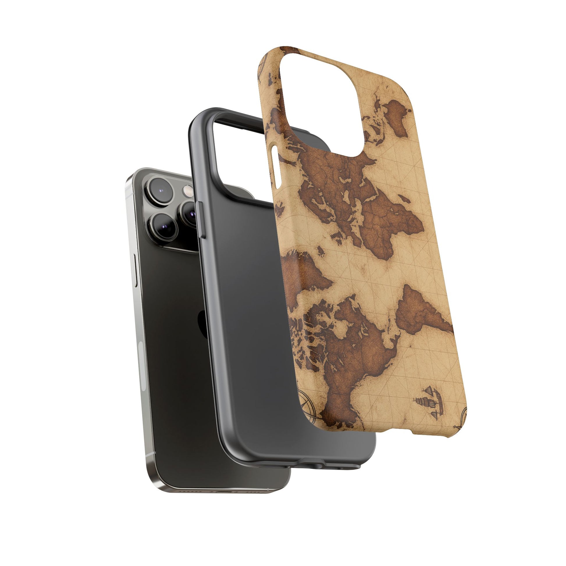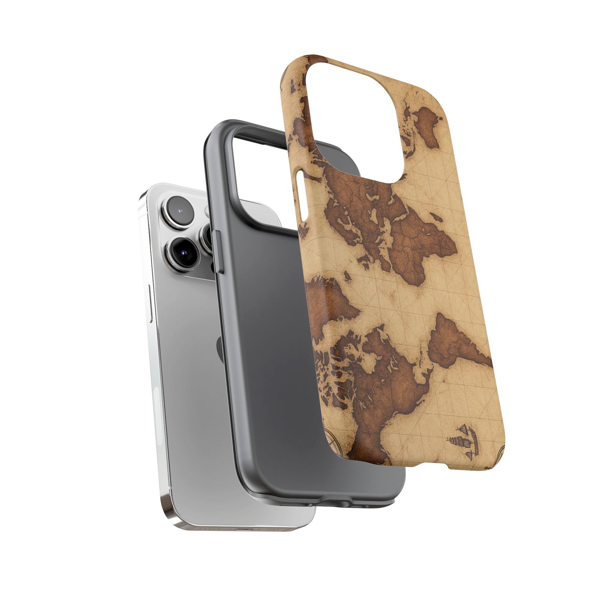 A phone case featuring a detailed world map design, perfect for travel enthusiasts and geography lovers. This durable and impact resistant case offers excellent protection against drops and tears, with a TPU silicone liner for shock absorption. Ideal for adults looking to protect their phones in style, this case is a great gift for birthdays, holidays, or as a treat for yourself.