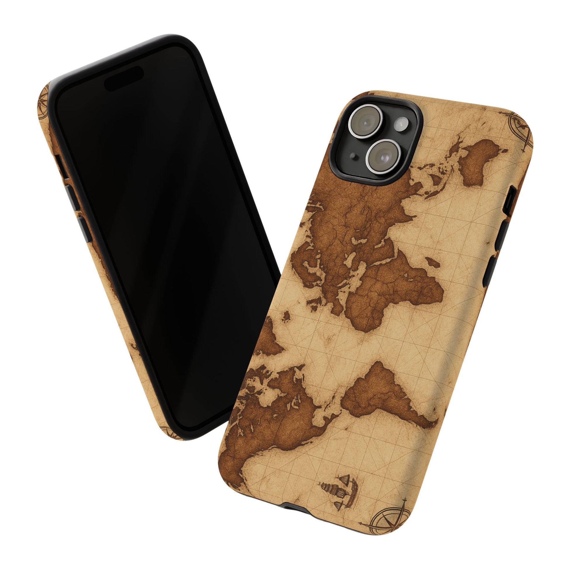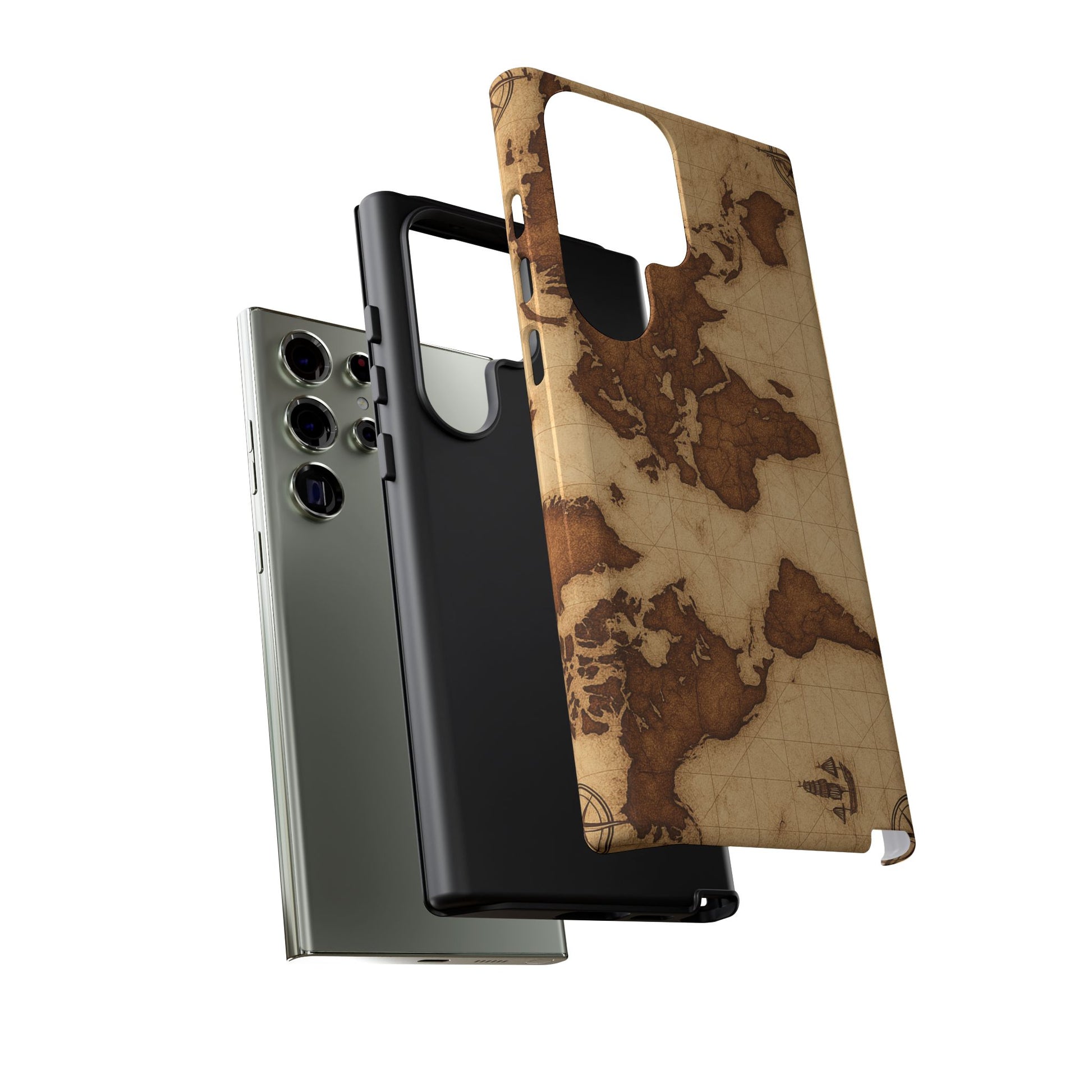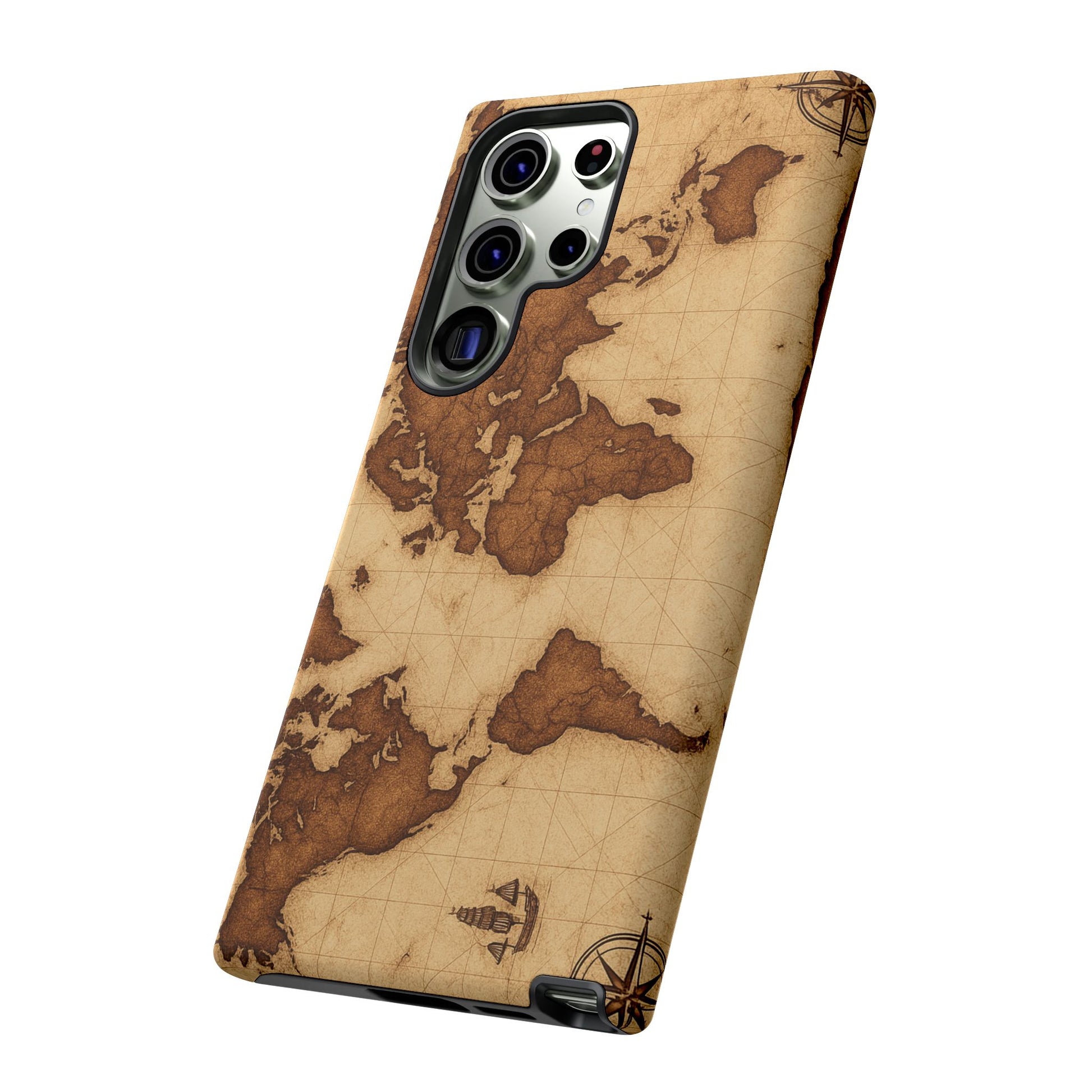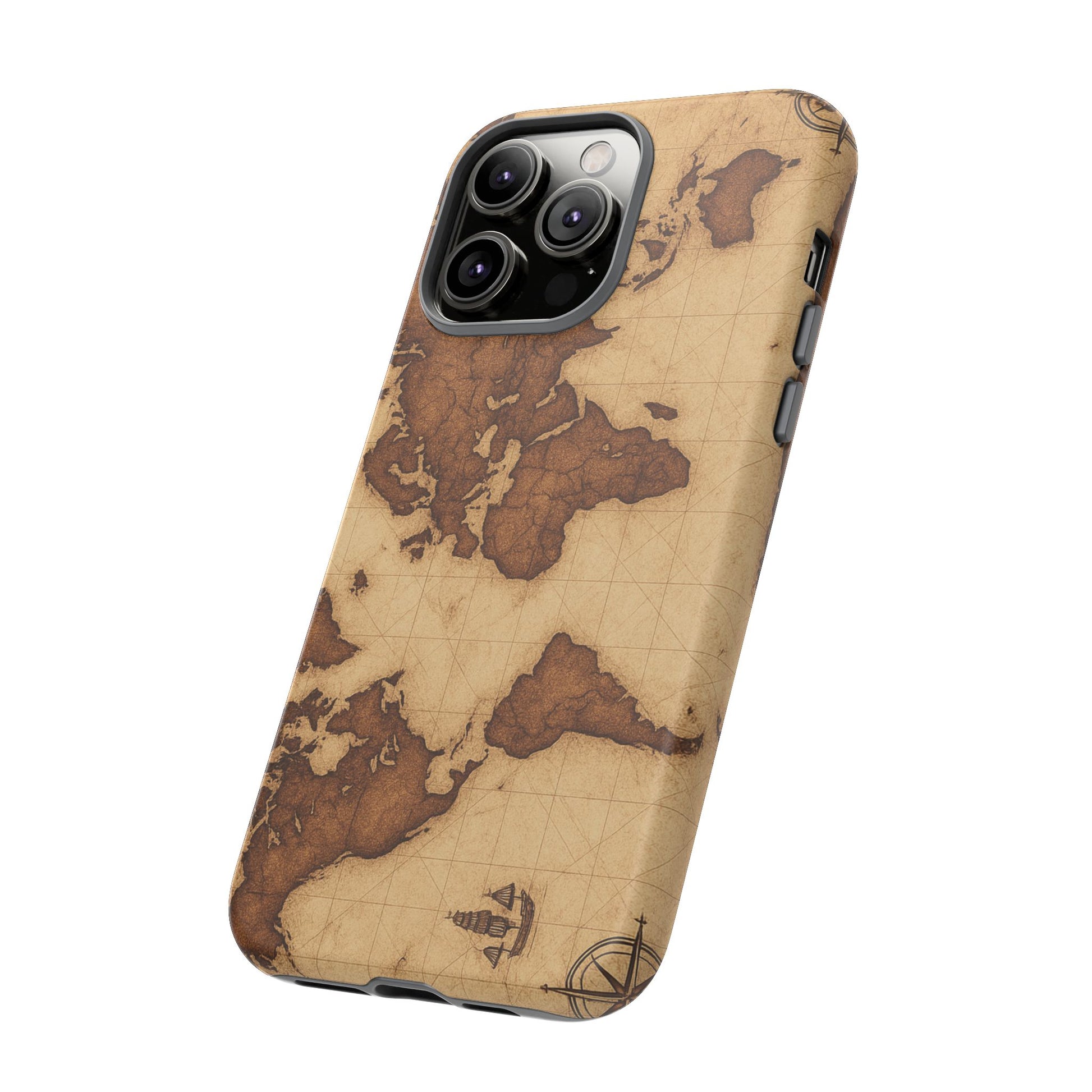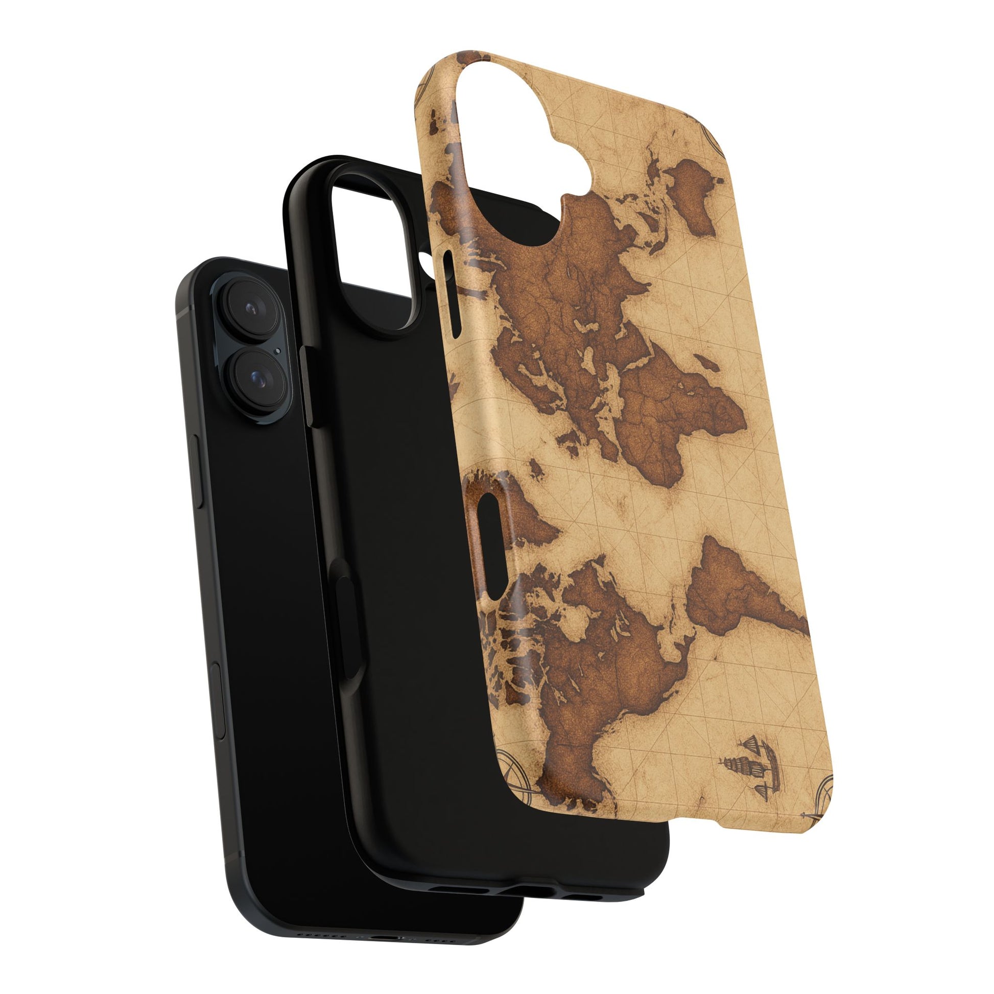 A phone case featuring a detailed world map design, perfect for travel enthusiasts and geography lovers. This durable and impact resistant case offers excellent protection against drops and tears, with a TPU silicone liner for shock absorption. Ideal for adults looking to protect their phones in style, this case is a great gift for birthdays, holidays, or as a treat for yourself.